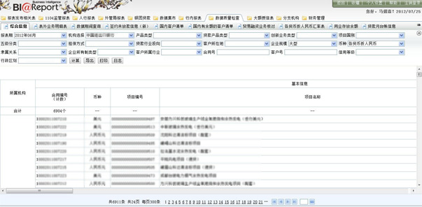 中国进出口银行新一代报表系统的数据来源于各务系统,包括信贷、国结、资金、会计、财管等,通过分析各业务系统之间的关系,并辅助以数据的补录,通过数据仓库的思想整合出符合"中国进出口银行新一代报表系统"要求的5大主题群,分别为"总账"、"信贷"、"国结"、"资金"、"存款",各主题群之间即可相互独立,也可相互关联,通过各主题群的应用,完成了"1104报表生成和报送"、"人行报表报送"、"外管局报表报送"、"银监会报表报送"、"行内各报表的查询和报送"、"客户风险管理"以及"统计工作考评"等应用模块。