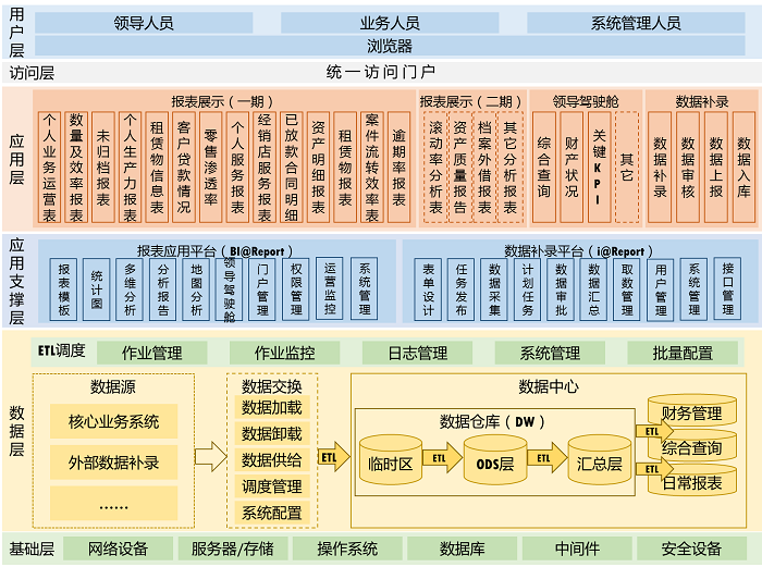 基于对业务数据的汇总、加工等数据模型设计,在成熟的数据采集产品和数据补录软件平台的基础上构建了数据展现分析模块、数据补录报送模块 、用户权限管理模块以及门户配置模块 。