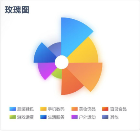 玫瑰图适合用于对比各类别的数据,而相比柱图/条形图等图表类型来说,南丁格尔玫瑰图能够放大数据差异。因为它使用扇区半径来表示数据的大小,半径和面积的关系是平方的关系,用户直觉上会通过面积来感知差异,所以它会将数据的比例大小夸大。